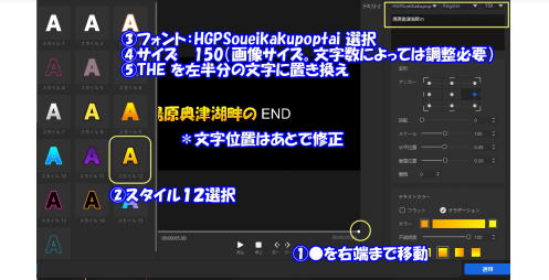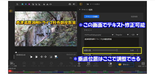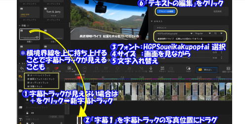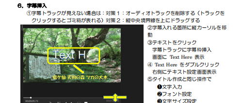 記録に同行していない人に見せるのに「字幕説明」は欠かすことが出来ません 画面を邪魔しない範囲で説明を加える どのような画面でも文字がハッキリ見える文字装飾が決めてになります 1字幕挿入後はコピペを行いテキスト設定を不要とする |
