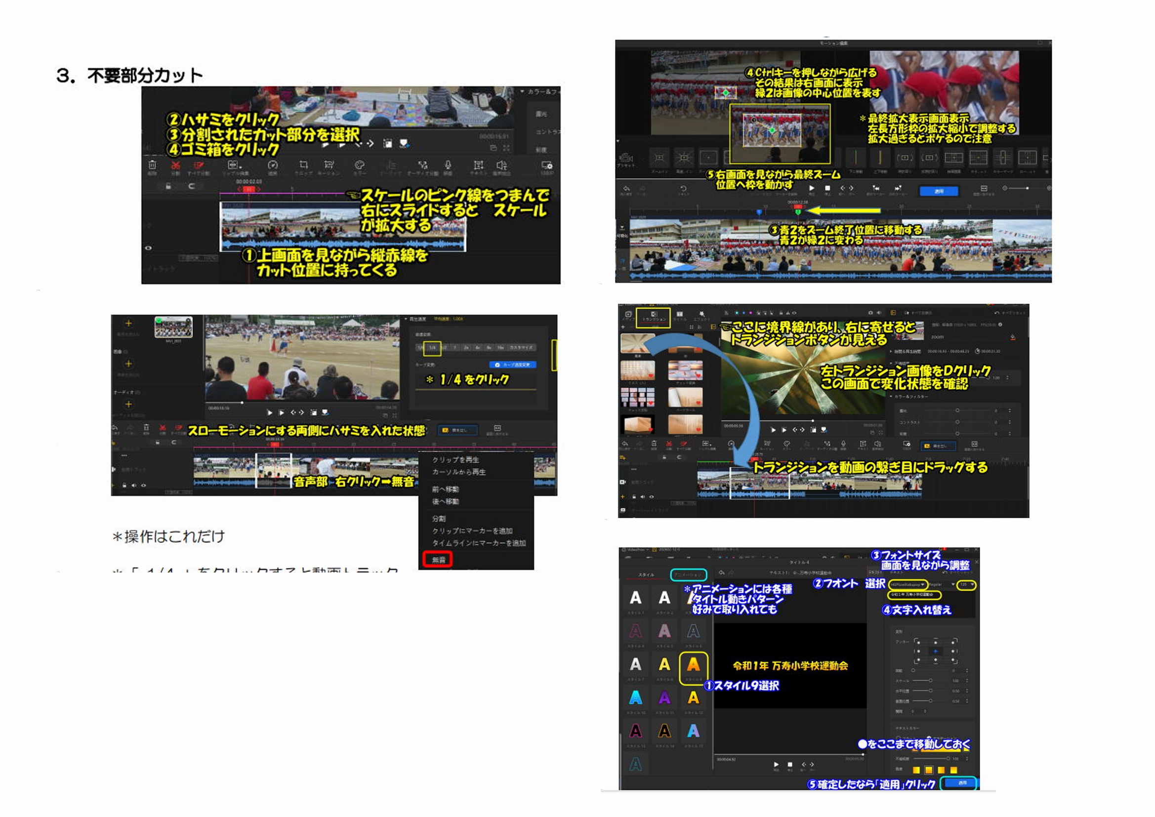 機能編 ①不要部分削除 ②ズームアップ ③スローモション ④トランジション挿入 ⑤シンプルタイトル ⑥動くタイトル ⑦字幕 ⑧BGM挿入 総集編 VideoProc Vlogger 動画編集 まとめ編 |