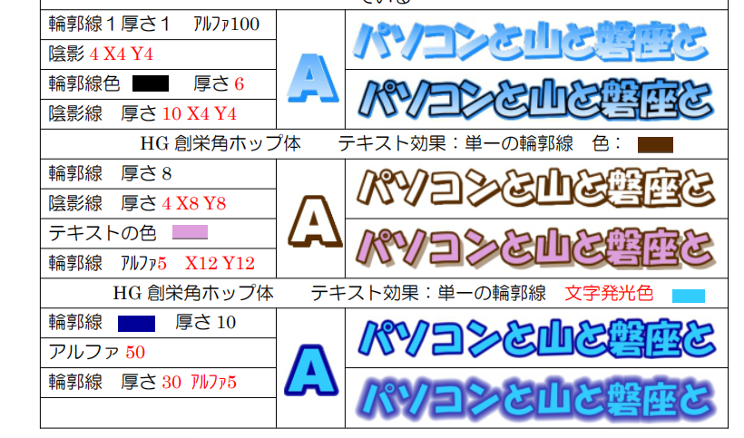 装飾文字は「タイプ48種+輪郭線+陰影+色」の組合せで無限の表現が可能です。どこを触ればどのように変化するかの一端の紹介です |