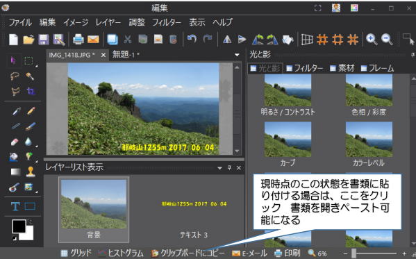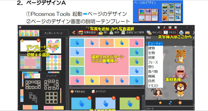 写真加工するアプリは色々ありますが経験上最も使い易く機能も豊富な『Picosmos Tools』を使った写真加工を説明します。 このページには利用し易い機能主体に載せていきますが、2023/04~12の9か月間Picosmosだけの講座を行っており『講習済み手順書』に載せておりますので、細かいことが必要になったときはそちらを参照して下さい 1.写真に文字書き 年賀状・チラシ・文章頁への挿入画像に |